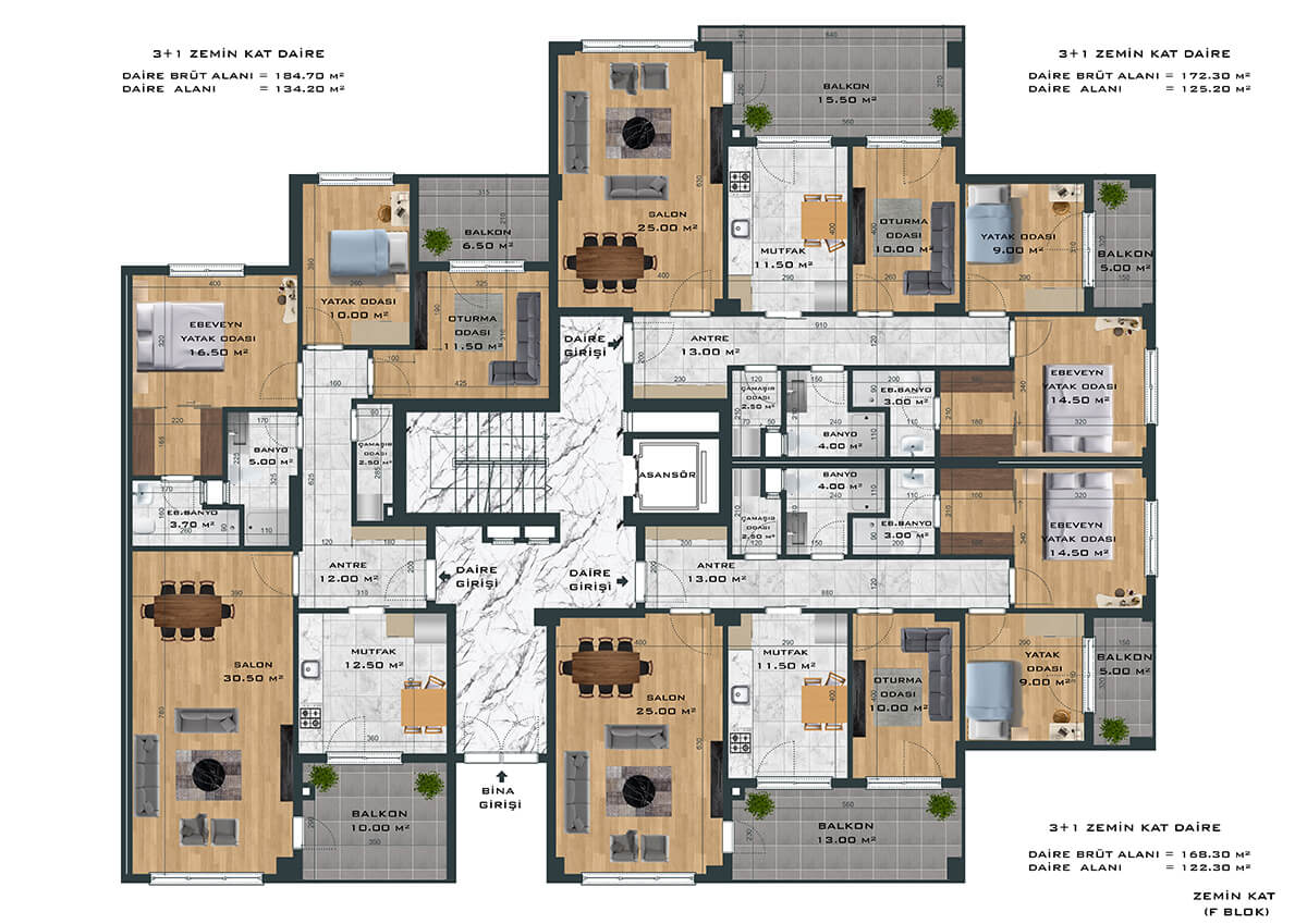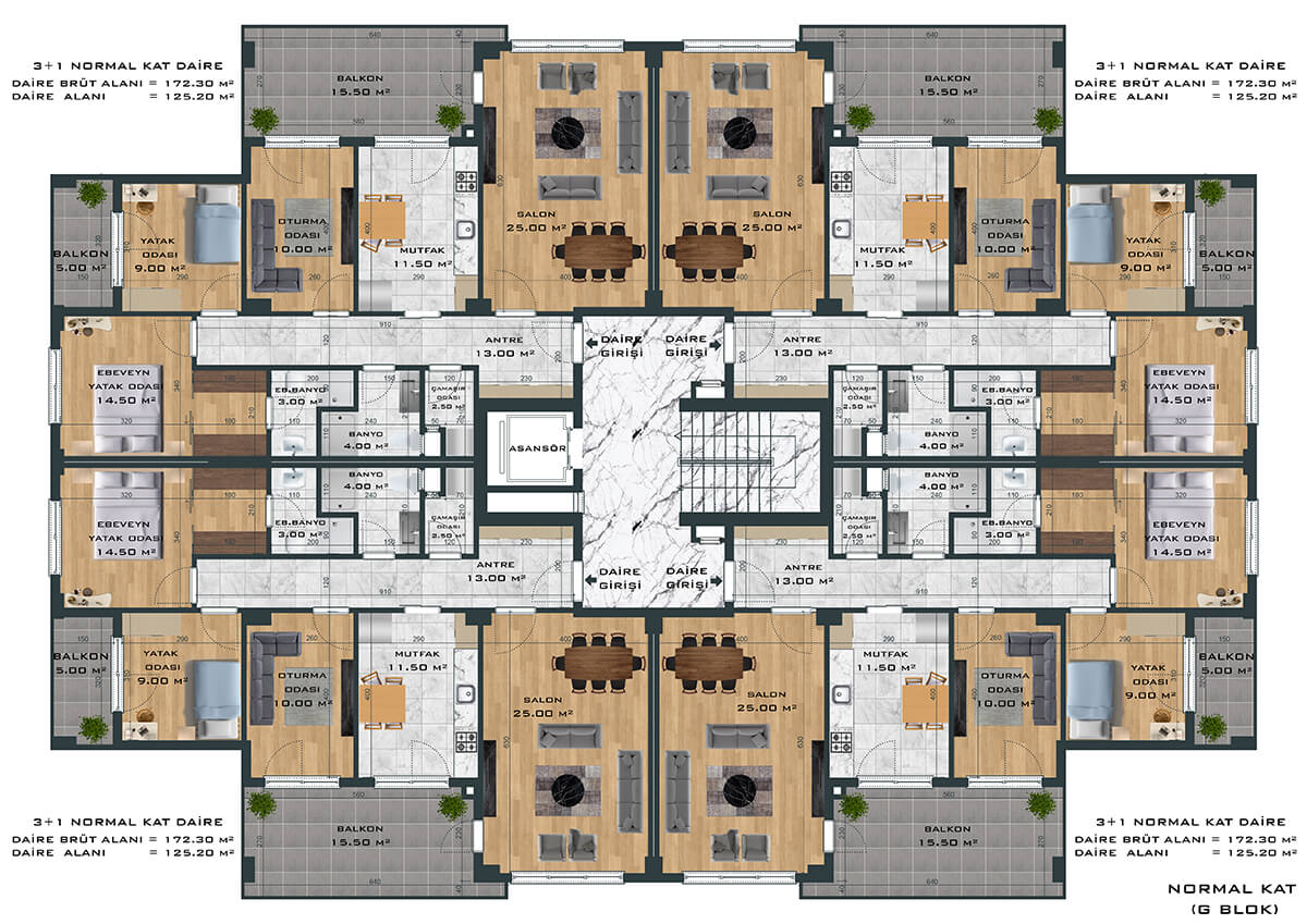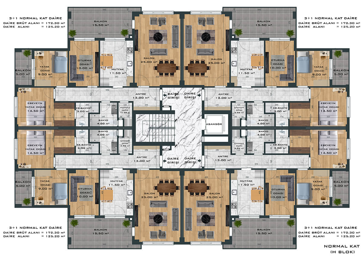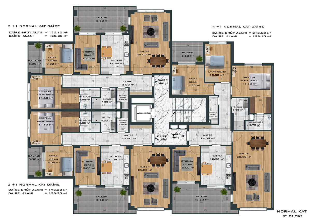 Toplamda 264 daireden oluşan proje, 3+1 ve 4+1 daire seçenekleri ile ferah ve samimi bir yaşam alanı yaratıyor. Bunun yanında bünyesinde 1’i fırın olmak üzere toplam 8 adet ticari alanı da barındıran proje size eksiksiz bir yaşam sunuyor.