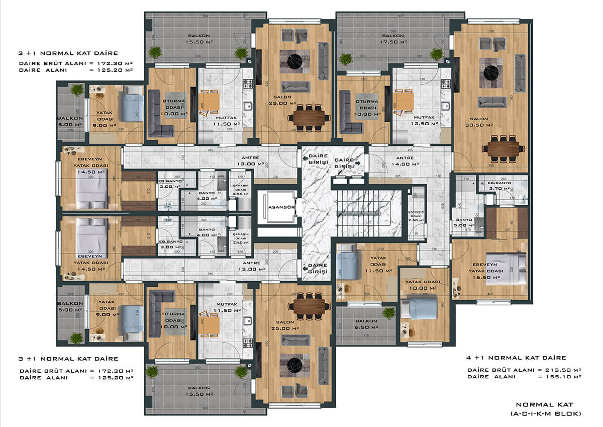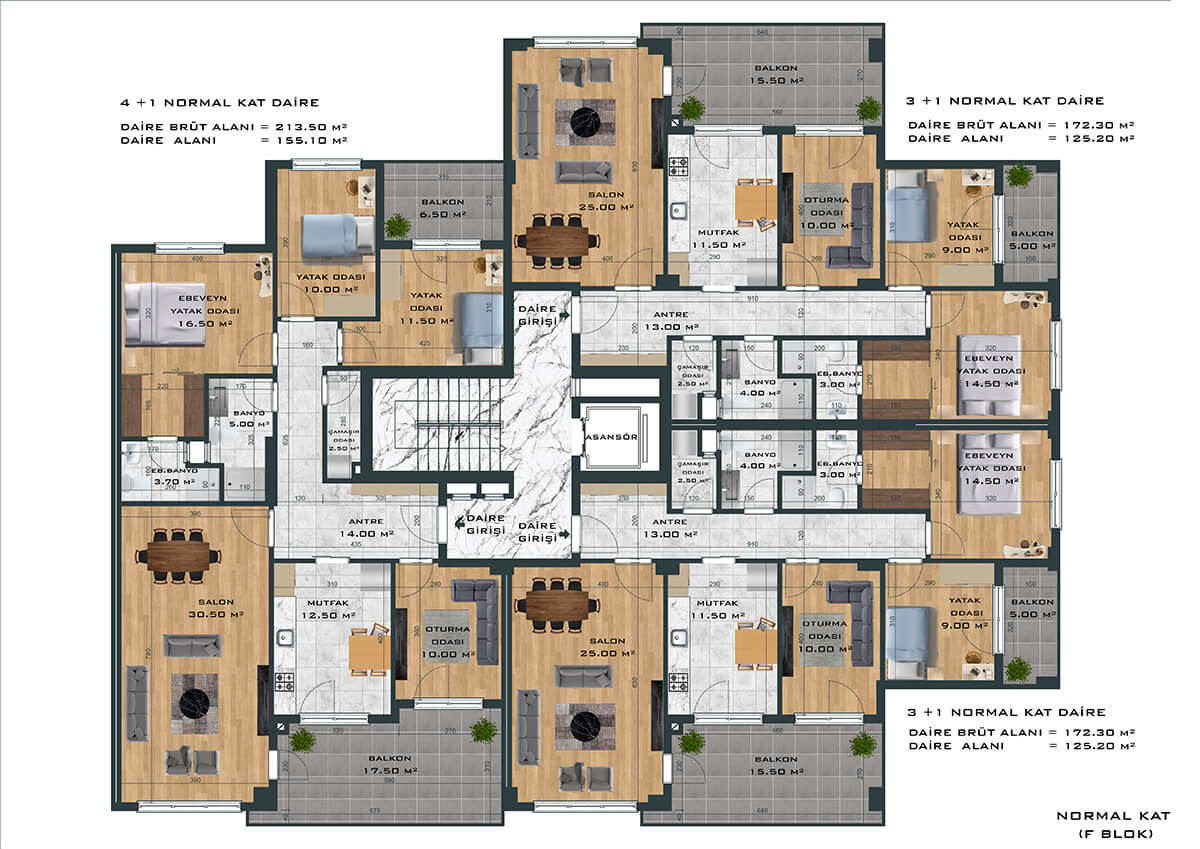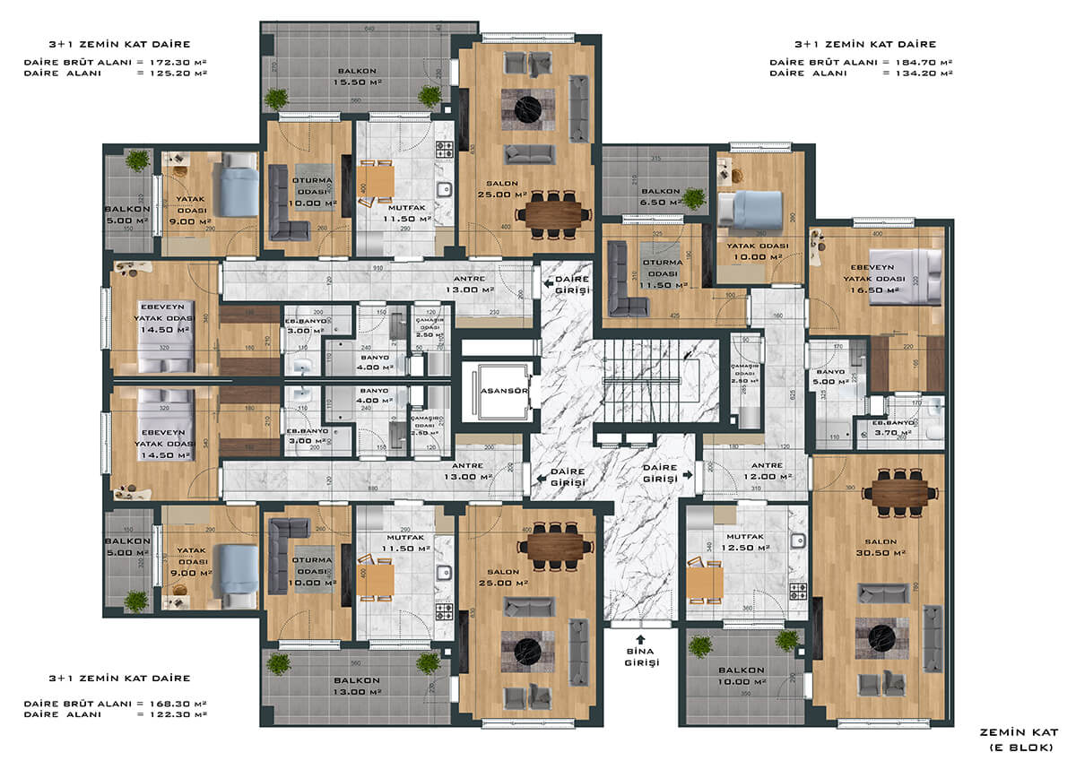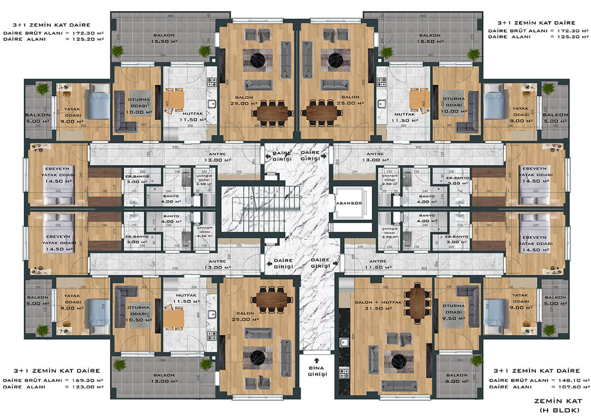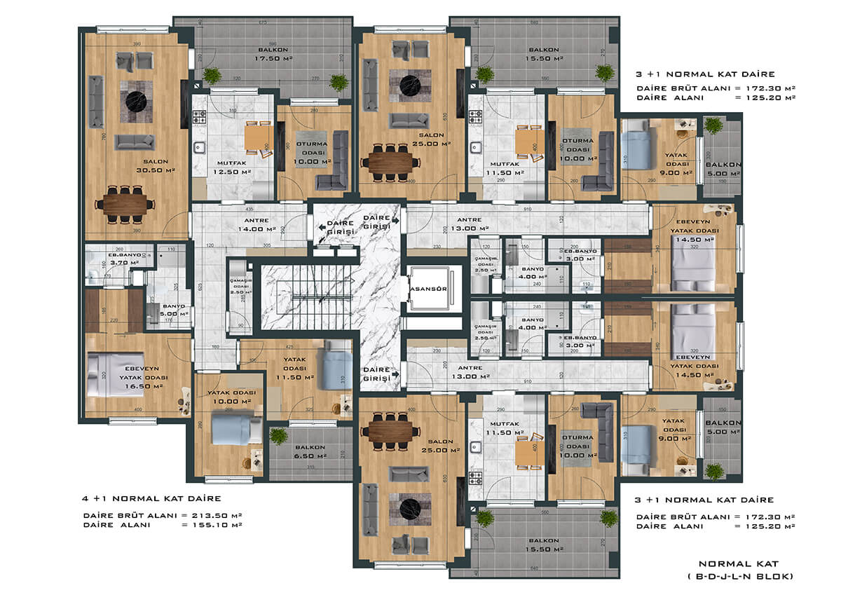 Toplamda 264 daireden oluşan proje, 3+1 ve 4+1 daire seçenekleri ile ferah ve samimi bir yaşam alanı yaratıyor. Bunun yanında bünyesinde 1’i fırın olmak üzere toplam 8 adet ticari alanı da barındıran proje size eksiksiz bir yaşam sunuyor.