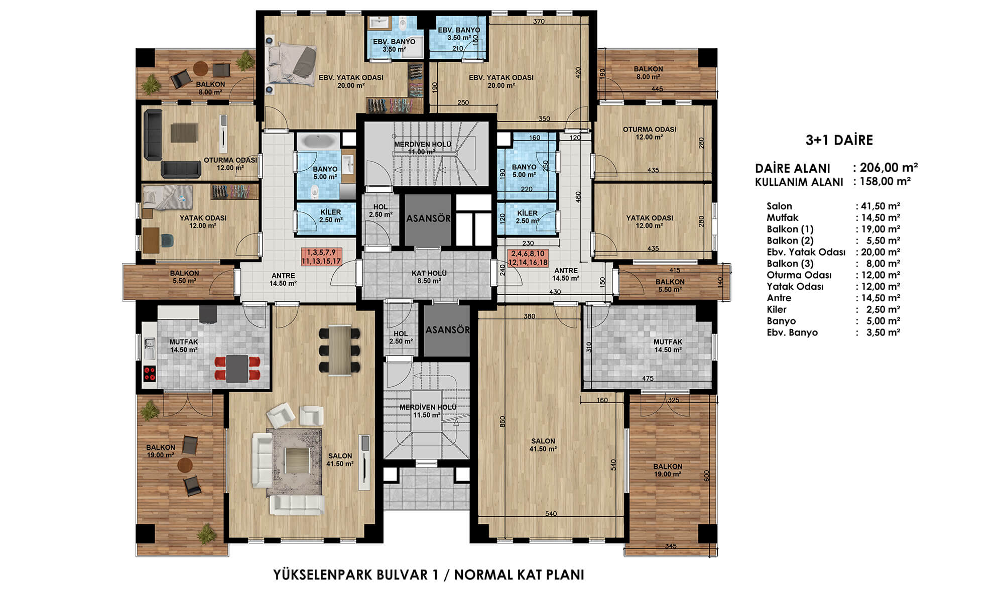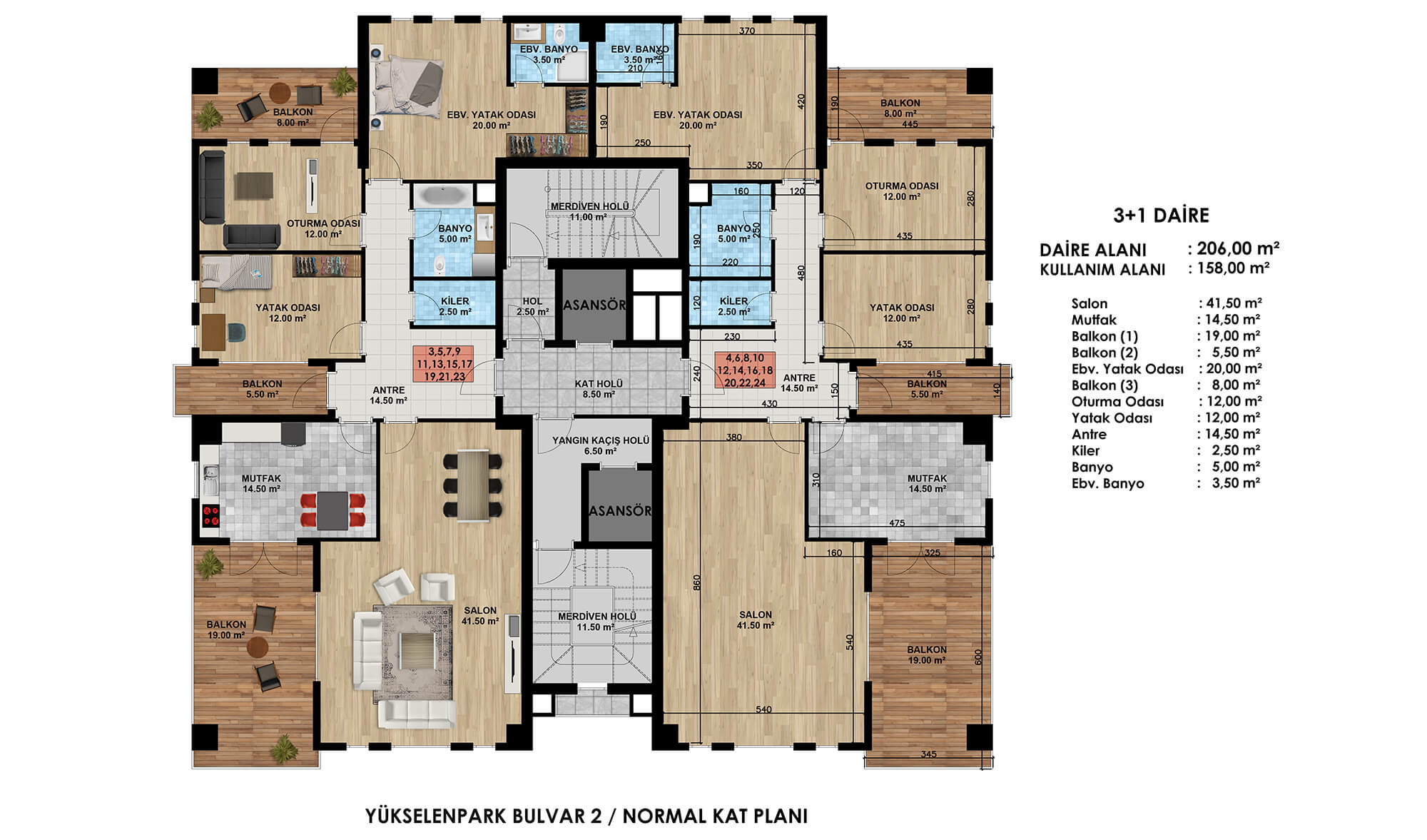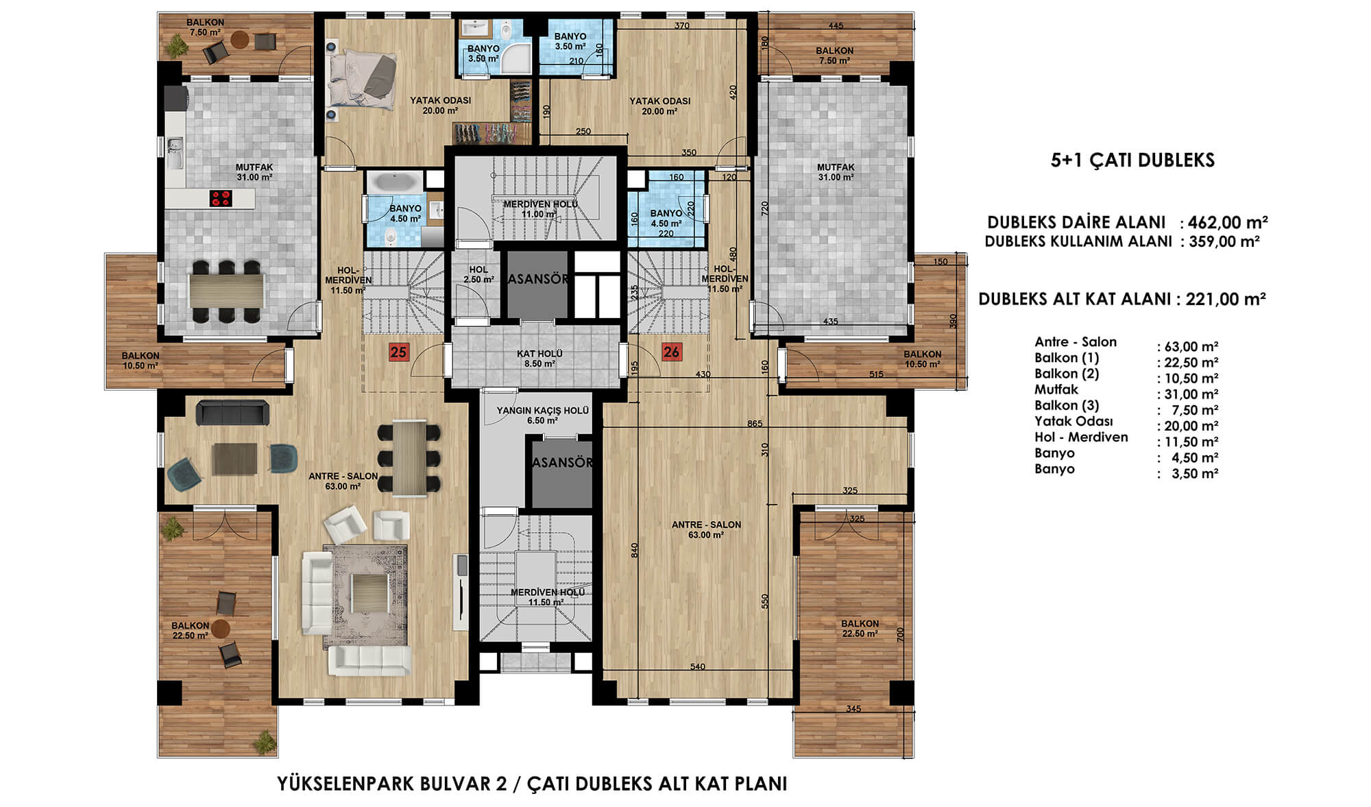 Toplamda 46 daireden oluşan proje; 3+1 normal, 5+1 dubleks daire seçenekleri ve 18 adet ticari alanı ile size mükemmel bir yaşam sunuyor.
