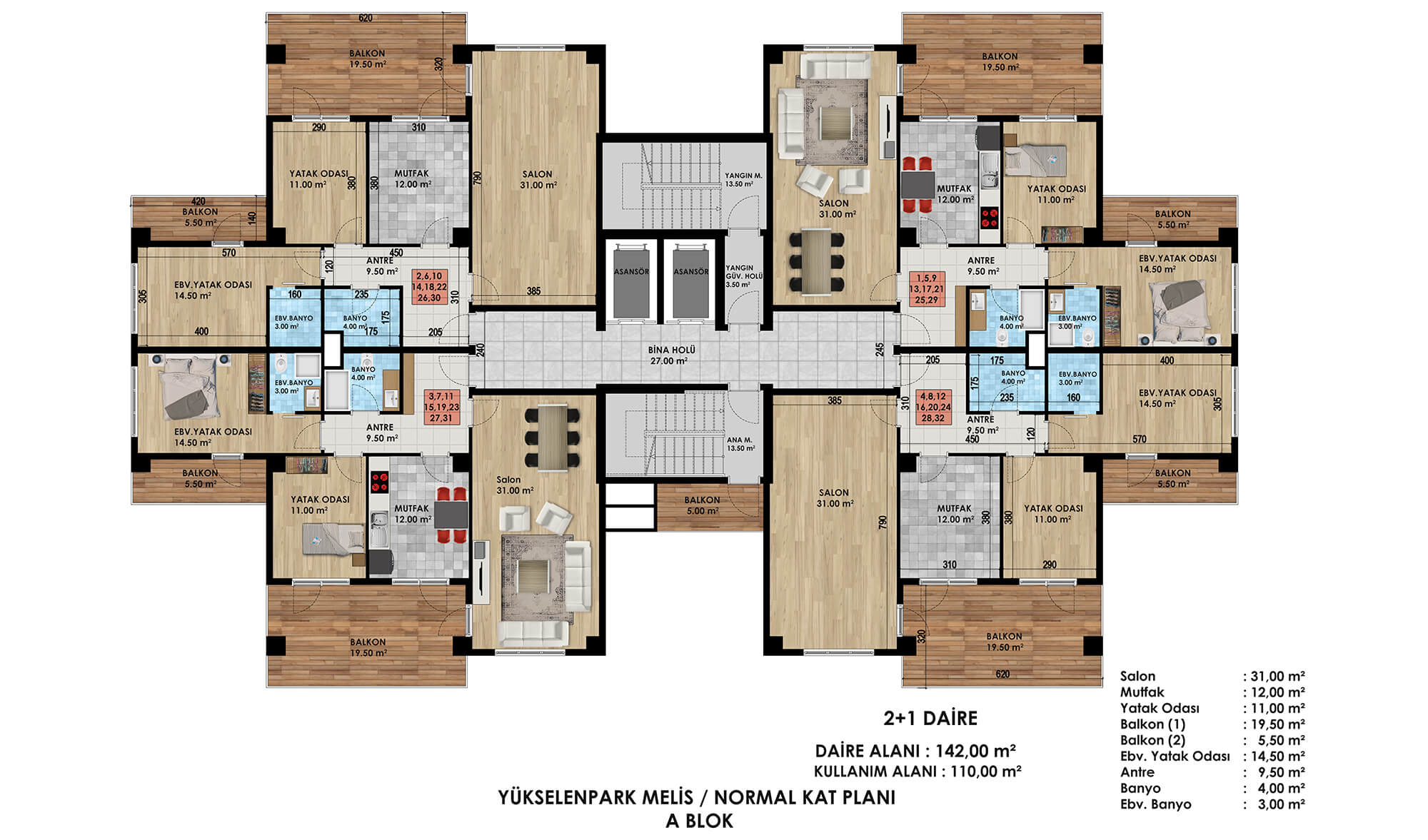 Toplamda 110 daireden oluşan proje; 2+1, 3+1, 4+1 normal daire seçeneklerinin yanında; 3+1, 4+1, 5+1 dubleks daire seçenekleri ile geniş ve ferah yaşam alanlarını sizin için inşa ediyor. Bunun yanında 25 ticari alan ve 20 ofisi içinde barındıran proje, bütünüyle bir yaşam kompleksi olarak özenle tasarlanıyor.
