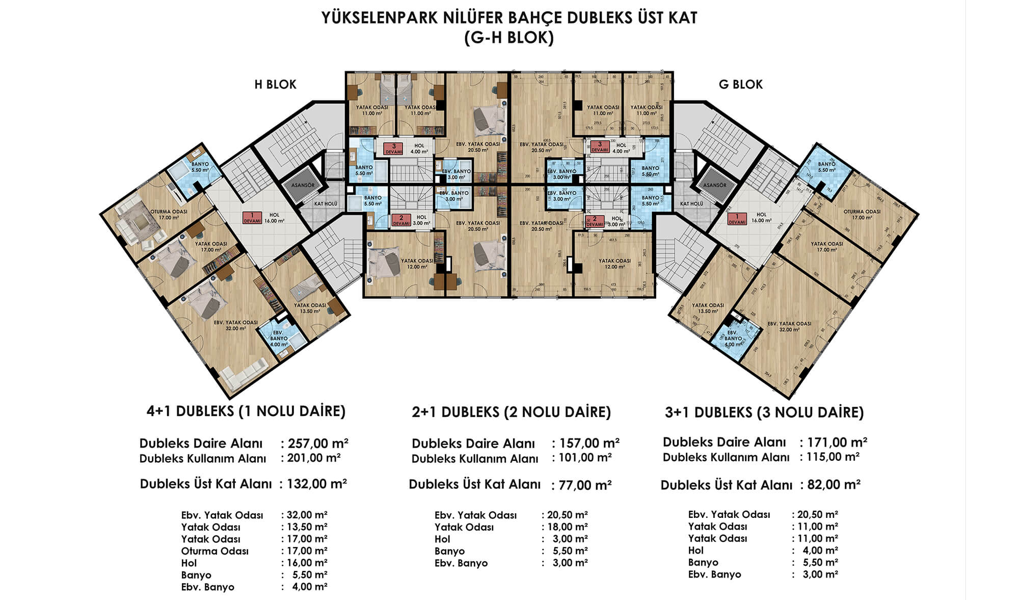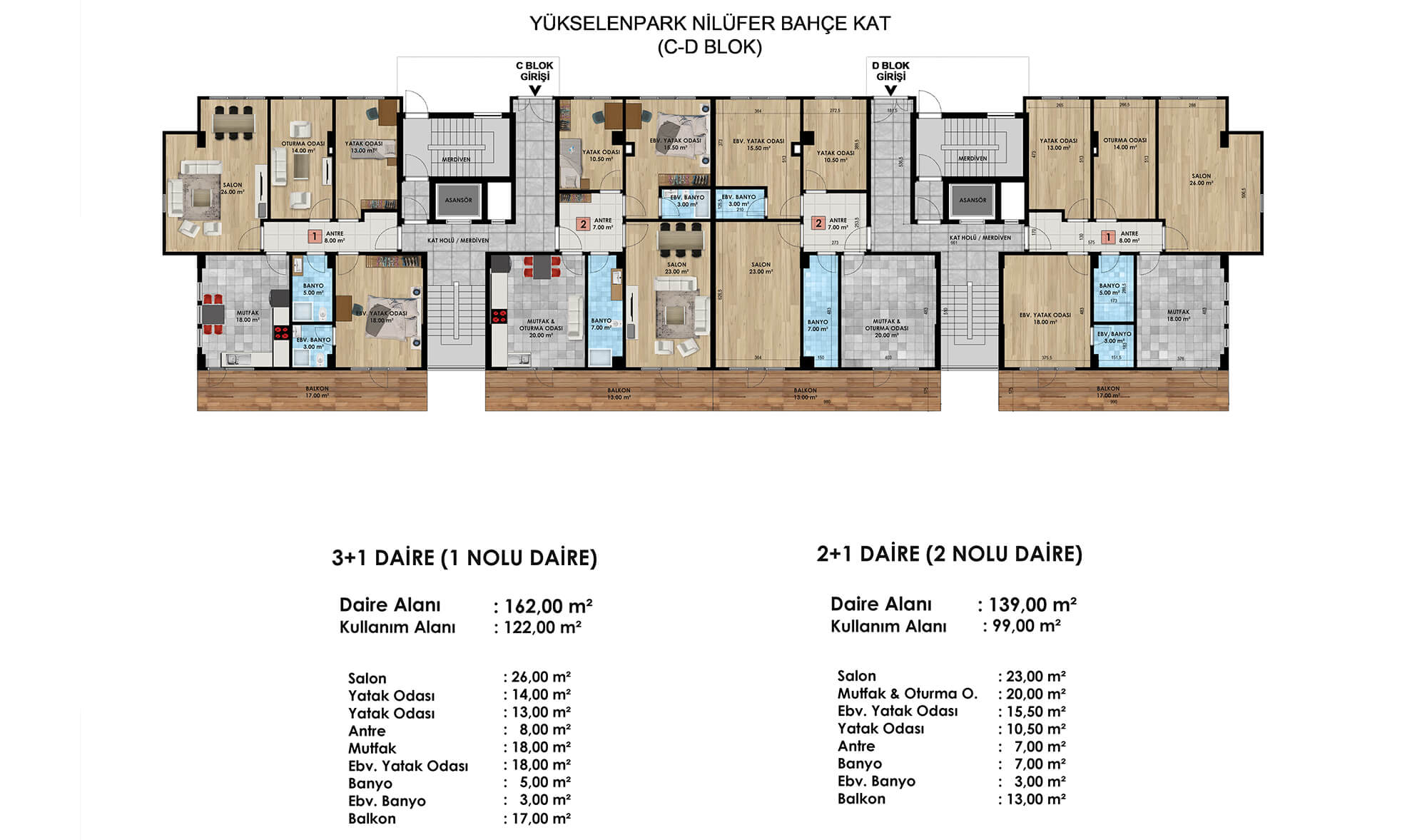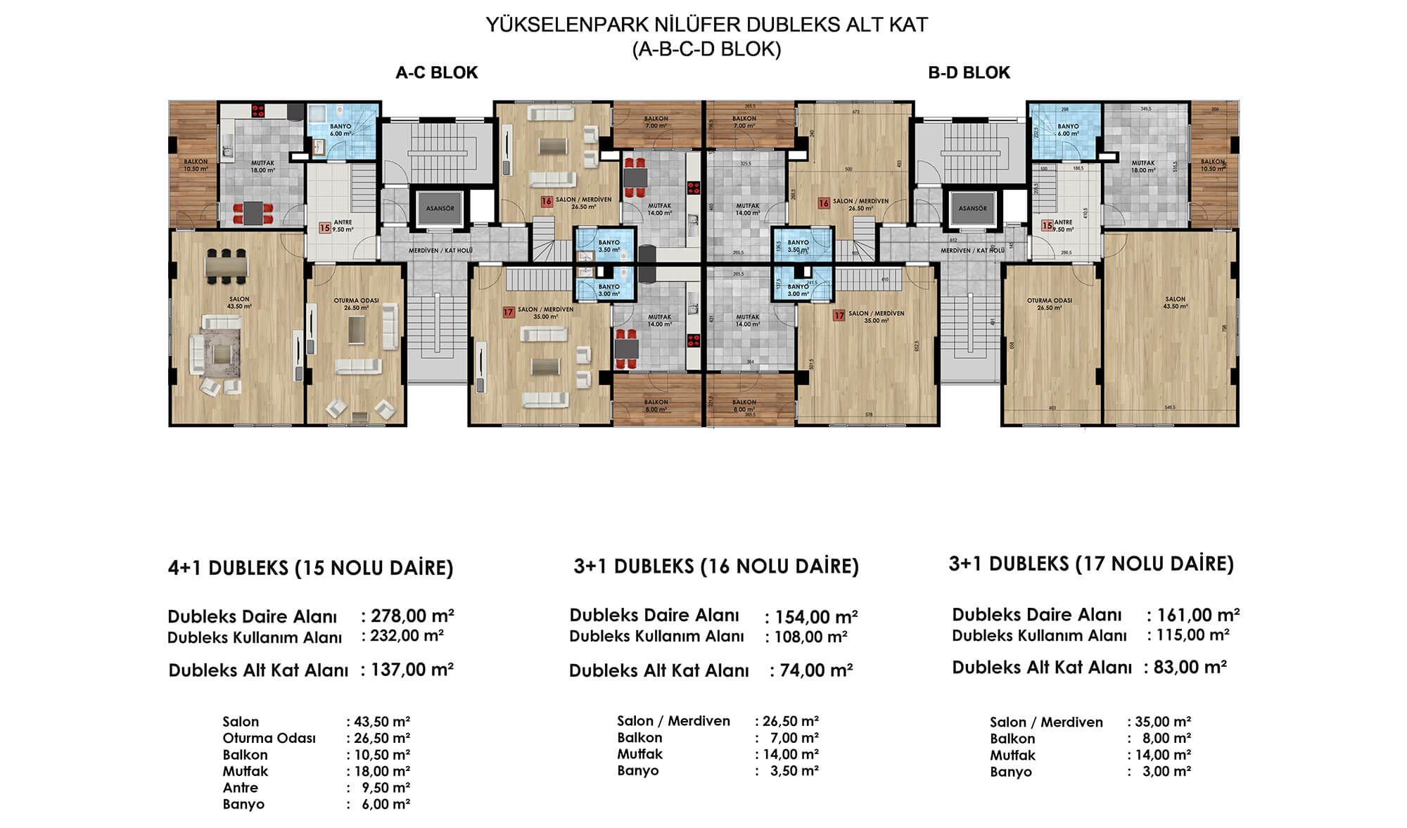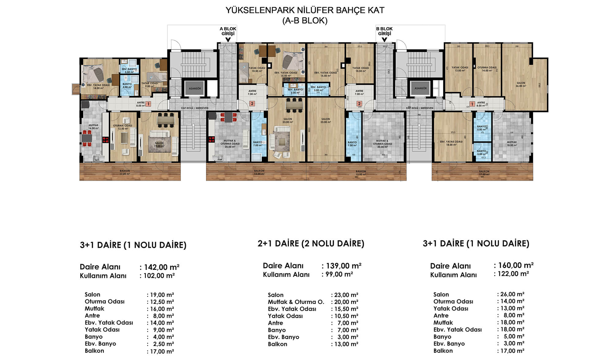 Toplamda 138 daireden oluşan proje; 3+1 normal daire seçeneğinin yanı sıra 2+1, 3+1, 4+1 dubleks daire seçenekleri ile sizlere konforlu bir yaşam alanı sunuyor.