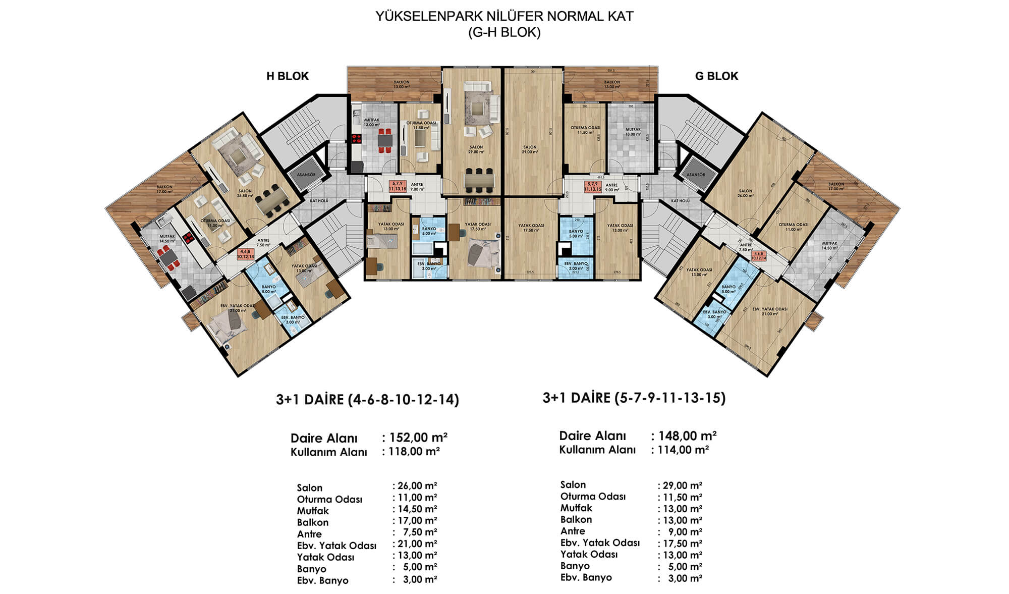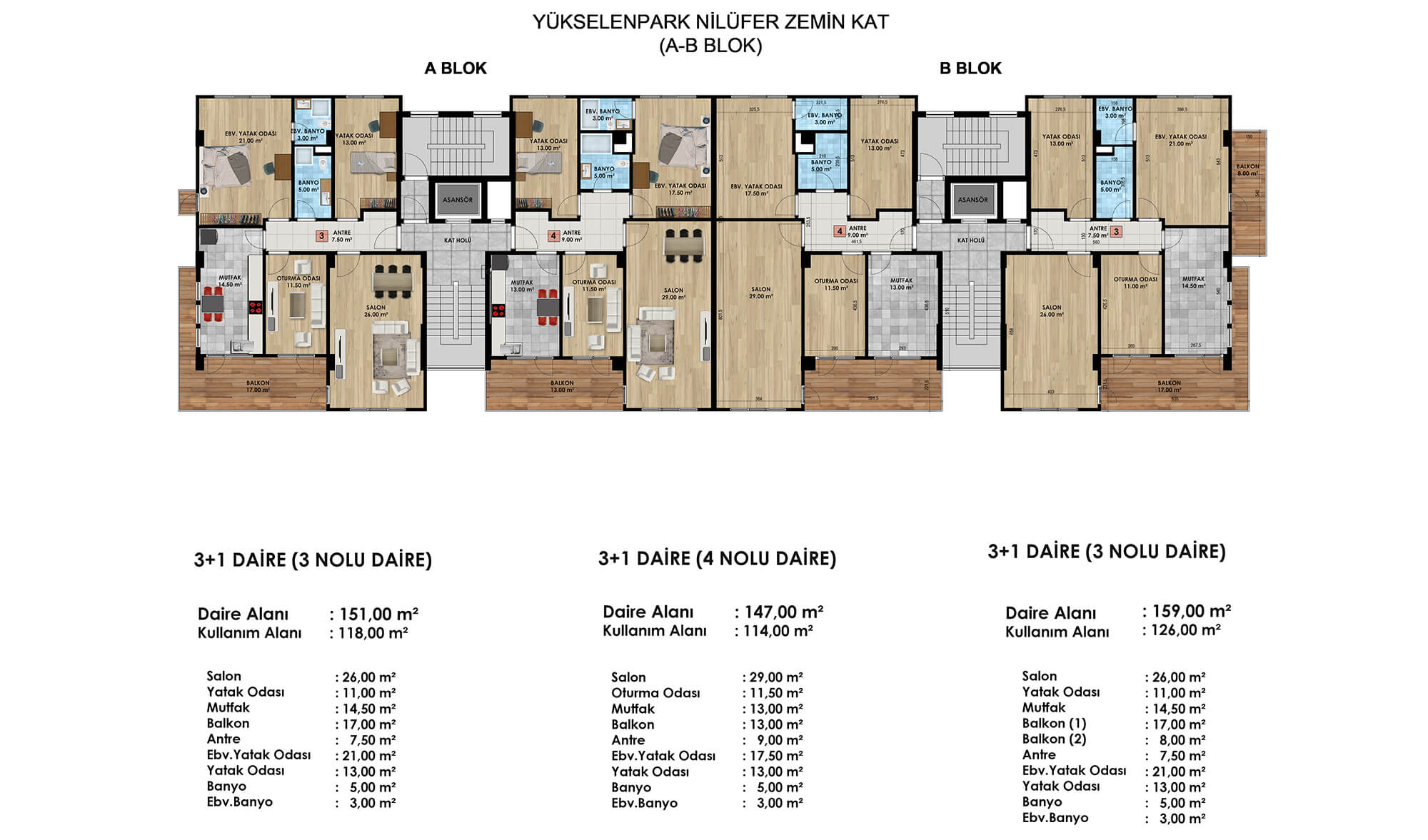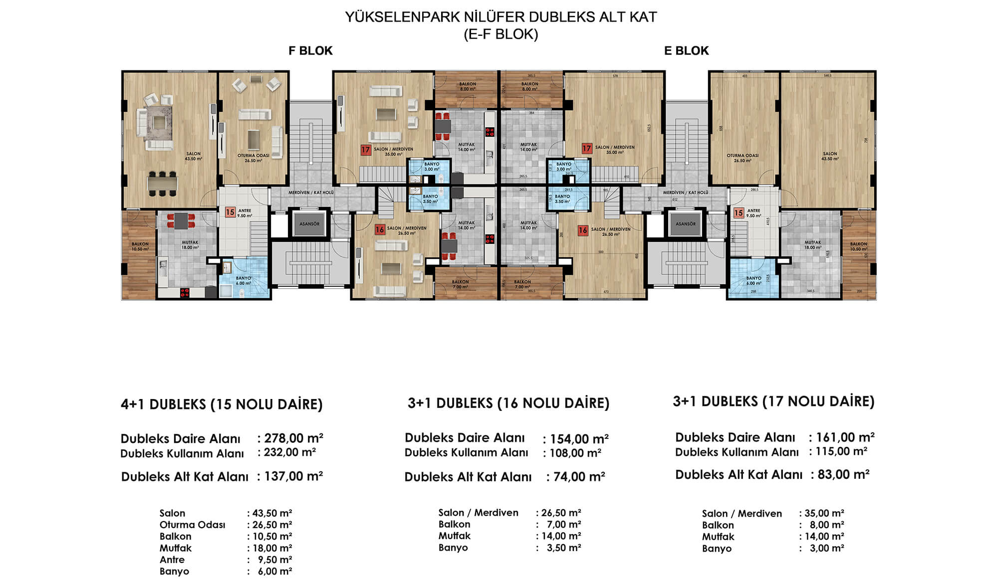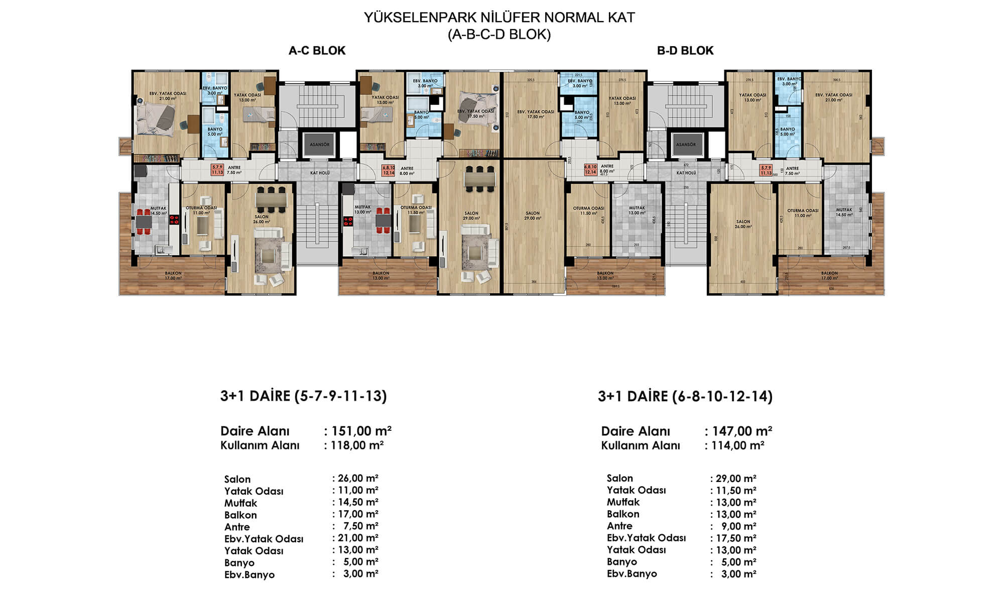 Toplamda 138 daireden oluşan proje; 3+1 normal daire seçeneğinin yanı sıra 2+1, 3+1, 4+1 dubleks daire seçenekleri ile sizlere konforlu bir yaşam alanı sunuyor.