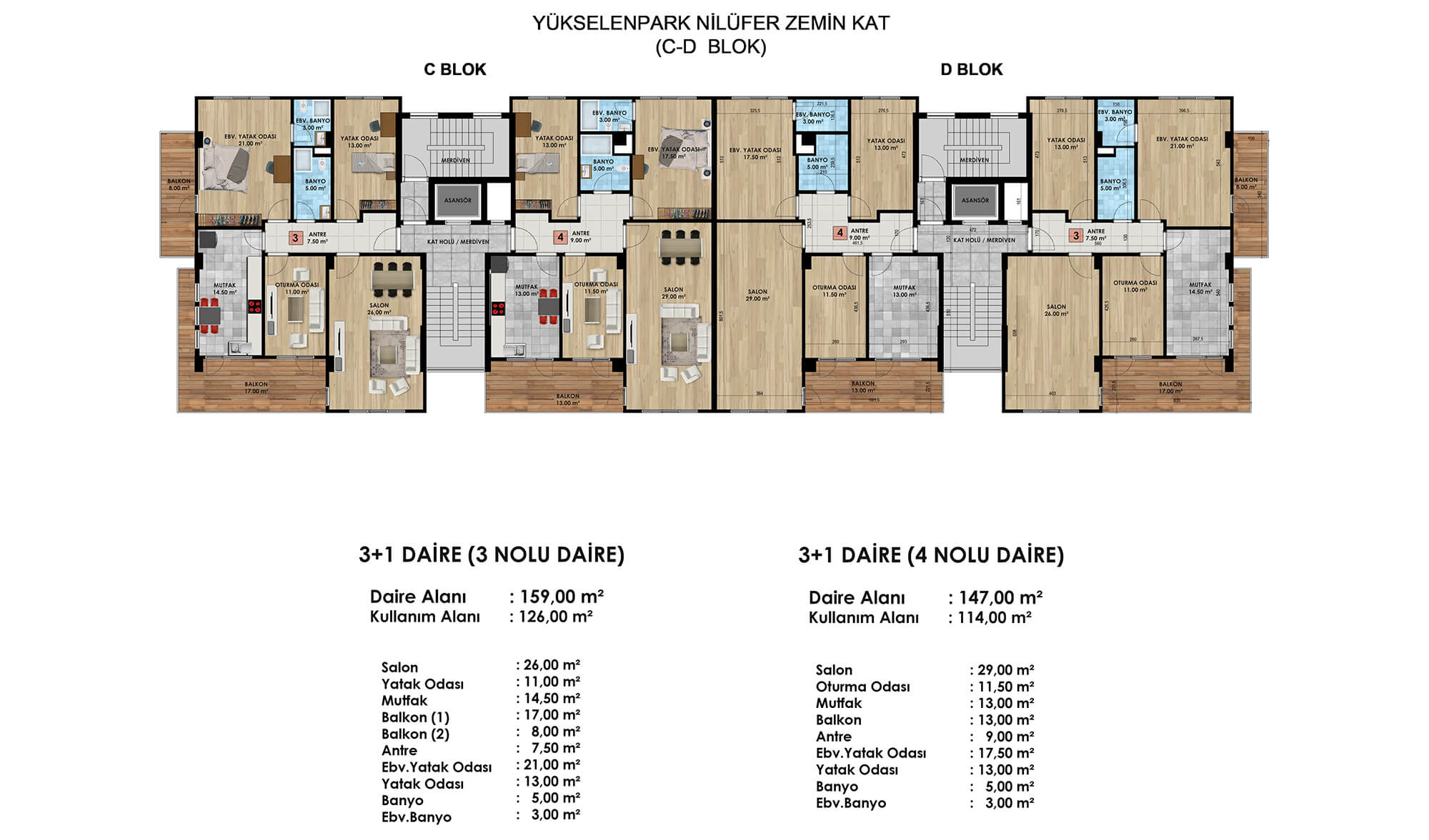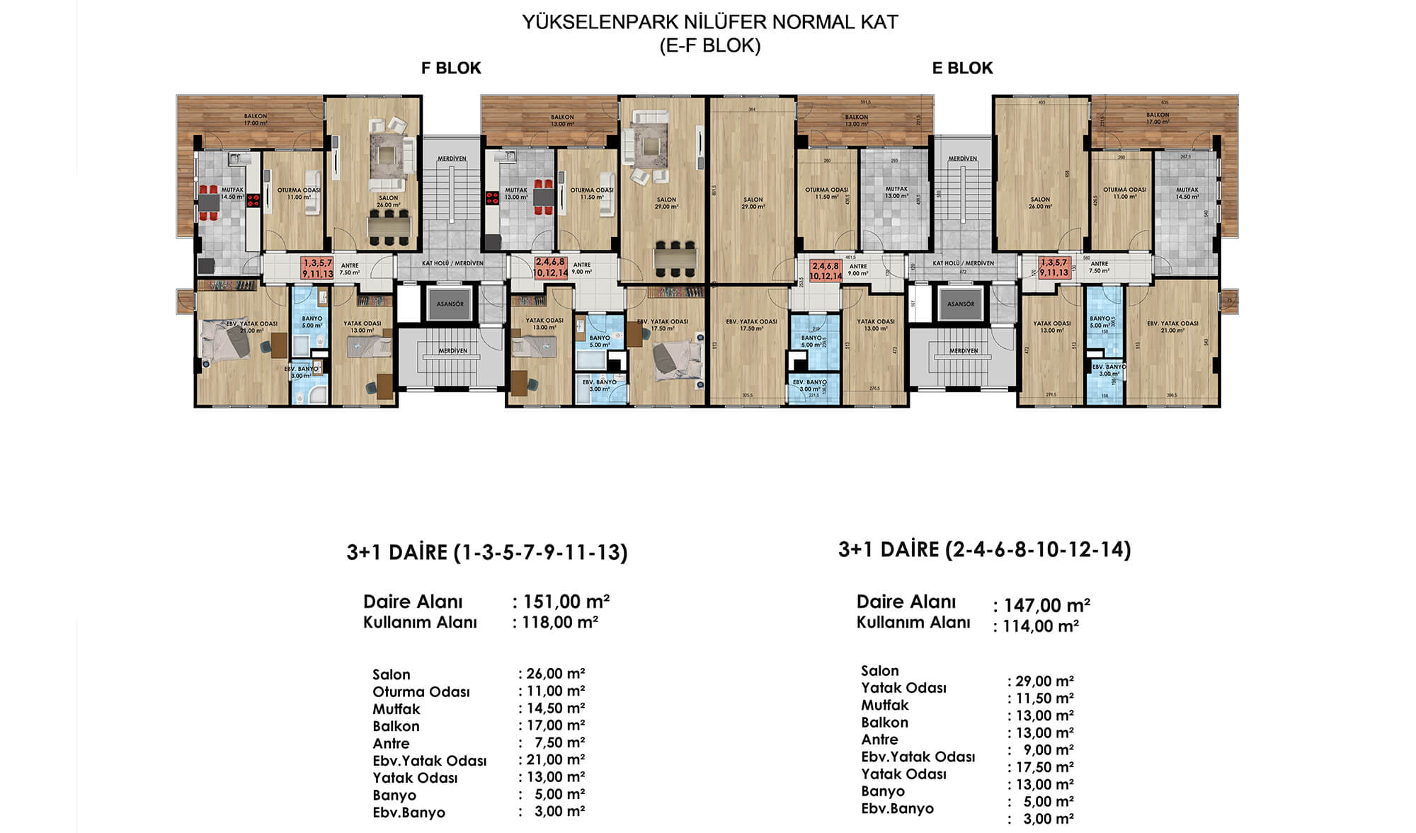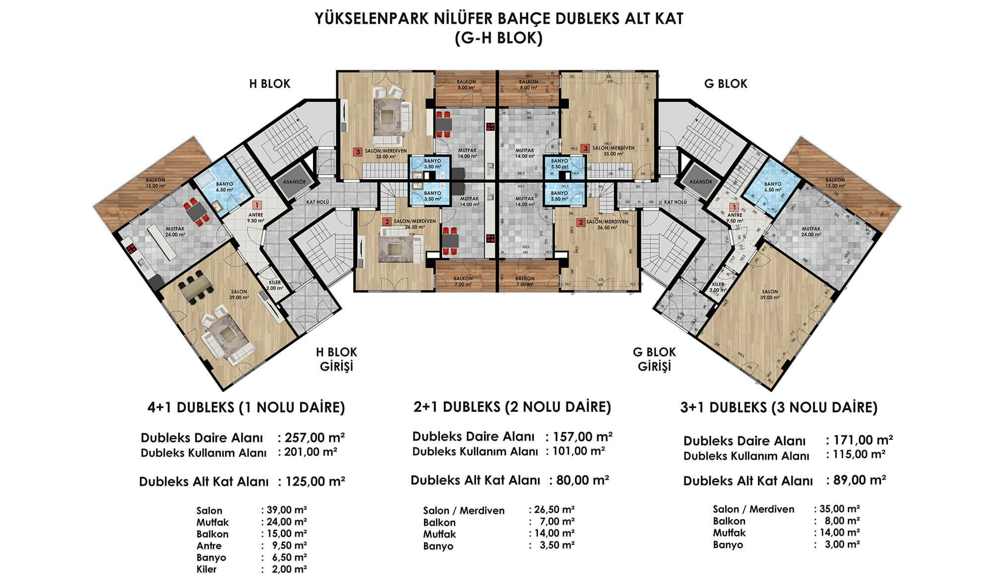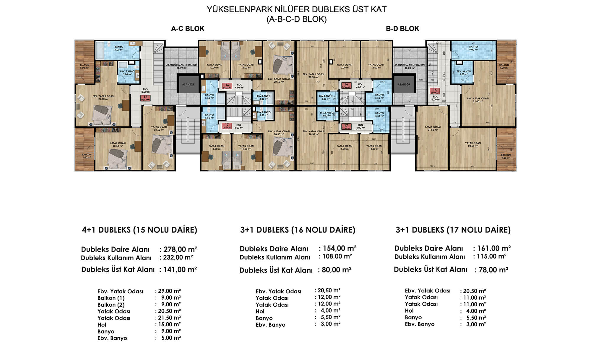 Toplamda 138 daireden oluşan proje; 3+1 normal daire seçeneğinin yanı sıra 2+1, 3+1, 4+1 dubleks daire seçenekleri ile sizlere konforlu bir yaşam alanı sunuyor.